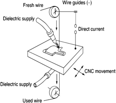 Das System besteht aus einem Draht (in der Regel Messing oder Molybdän), einer dielektrischen Flüssigkeit (in der Regel deionisiertes Wasser), einer Stromversorgung und einem computergesteuerten Bewegungssystem. Die Wahl des Drahtes beeinflusst alles - Geschwindigkeit, Genauigkeit, Kosten usw.